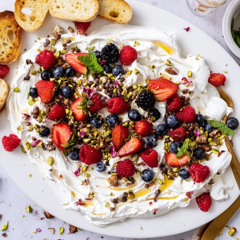 - Toppings: 150 g (1 cup) mixed fresh berries (strawberries, blueberries, raspberries, blackberries), 2 tbsp chopped toasted pistachios or almonds, 1 tbsp dried edible rose petals (optional), 2 tbsp mini chocolate chips or shavings, 2 tbsp granola (optional), 1 tbsp fresh mint leaves, torn