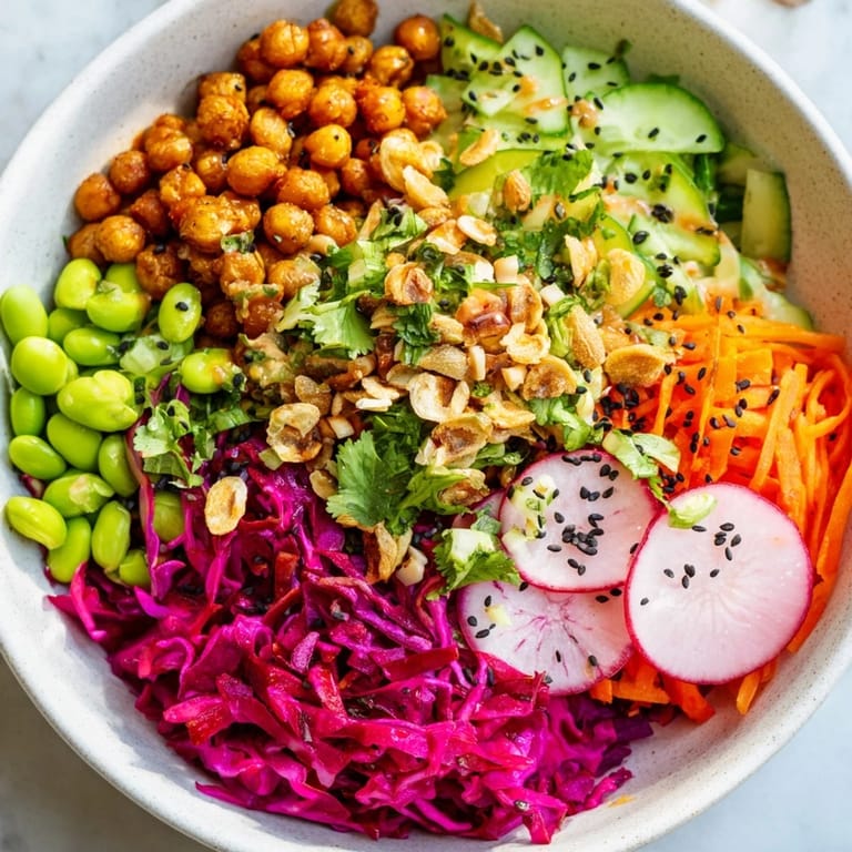 The mix of roasted chickpeas, crispy rice puffs, pumpkin seeds, and fresh vegetables delivers irresistible crunch.