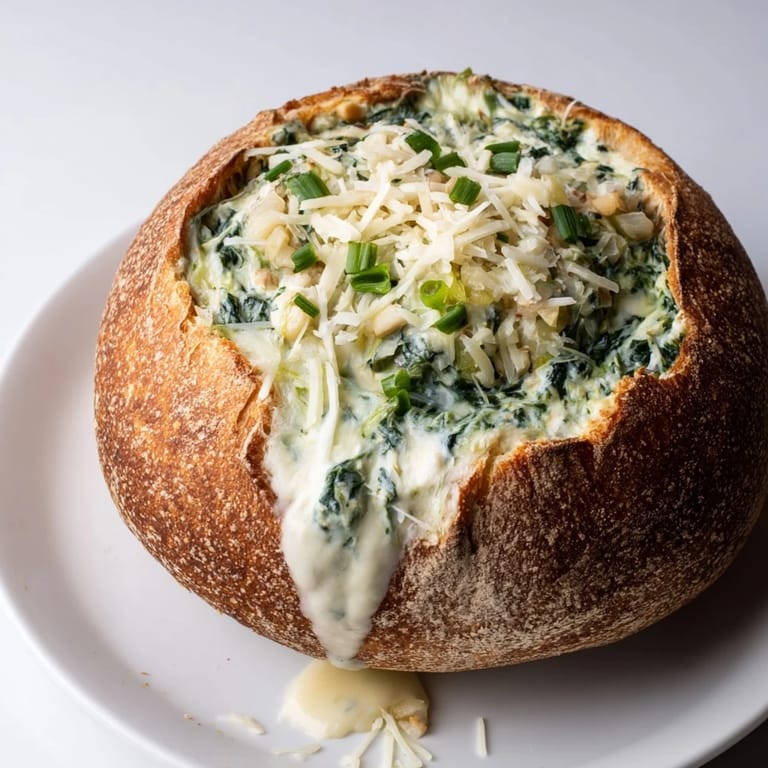 - Spoon the spinach dip mixture into the hollowed bread bowl.
