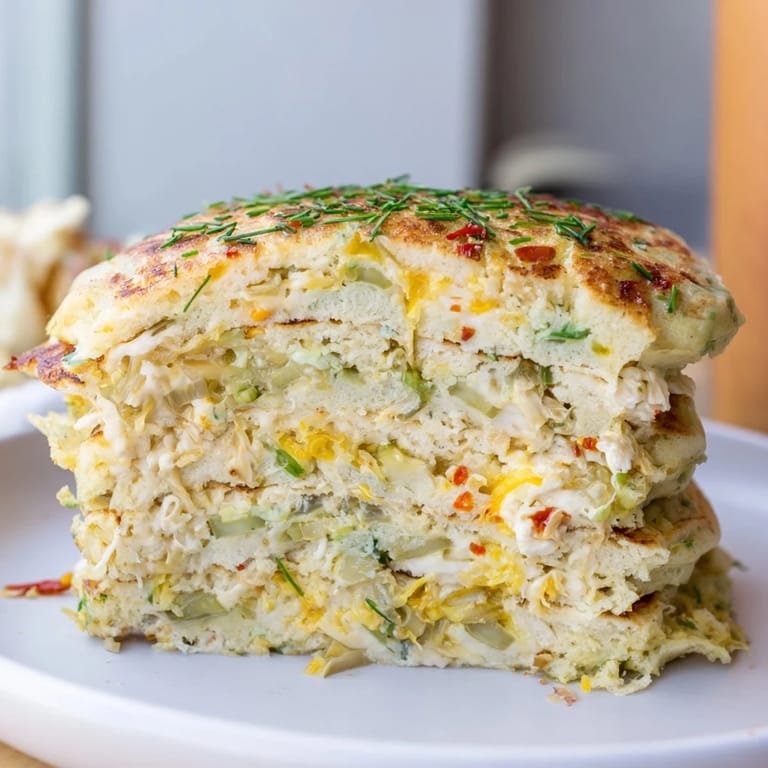 Pin A bold and savory fusion of fluffy pancake bars infused with tangy dill pickles, spicy chili, and aromatic garlic: an adventurous, umami-rich snack or brunch treat.