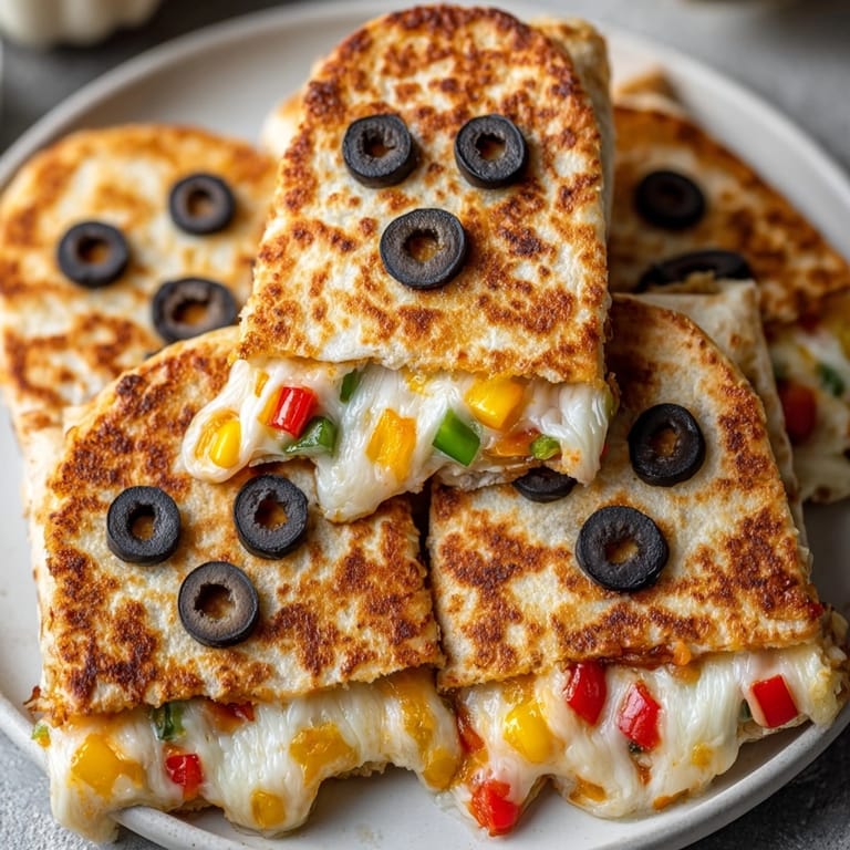 - Carefully press black olive slices into the upper tortilla for eyes and small pieces for the mouth Get creative the ghostly faces make each quesadilla unique