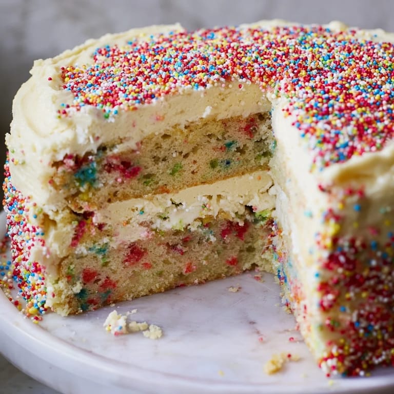 Pin A festive, moist vanilla sponge cake layered with creamy buttercream and topped with colorful sprinkles—a joyful treat perfect for any celebration.