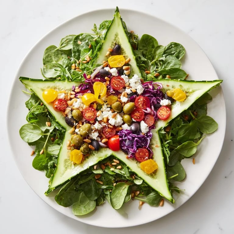 Creating the Star of David with your vegetables isn't just about aesthetics—it's about understanding how color, texture, and flavor work together in a composition. When you arrange vegetables deliberately, you're creating flavor pathways that guide someone through different taste experiences with each forkful. The softness of the greens contrasts with the crispness of the peppers, the sweetness of the tomatoes plays against the brine of the olives, and the creamy feta acts as a bridge between everything else. This kind of intentional arrangement makes people slow down and actually taste their food instead of just eating it.